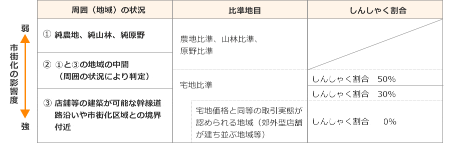 また、評価対象地(雑種地)の法的規制等(建築制限、開発行為の可否等)の斟酌は、市街化の影響度と評価対象地(雑種地)の利用状況を勘案し、次表による斟酌割合を用いて評価します。
